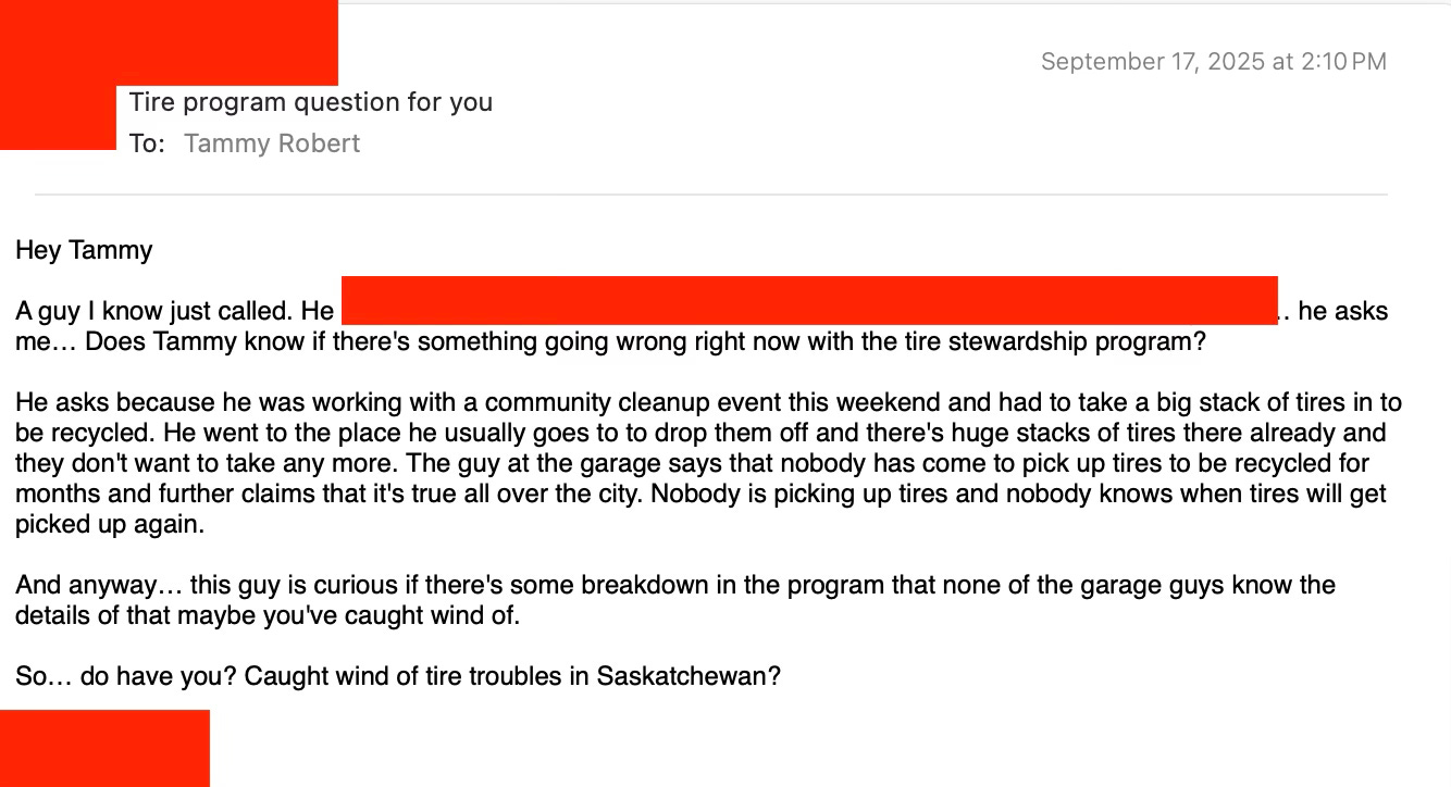 Why yes, I have caught wind that there is something wrong with Saskatchewan’s tire stewardship program:
