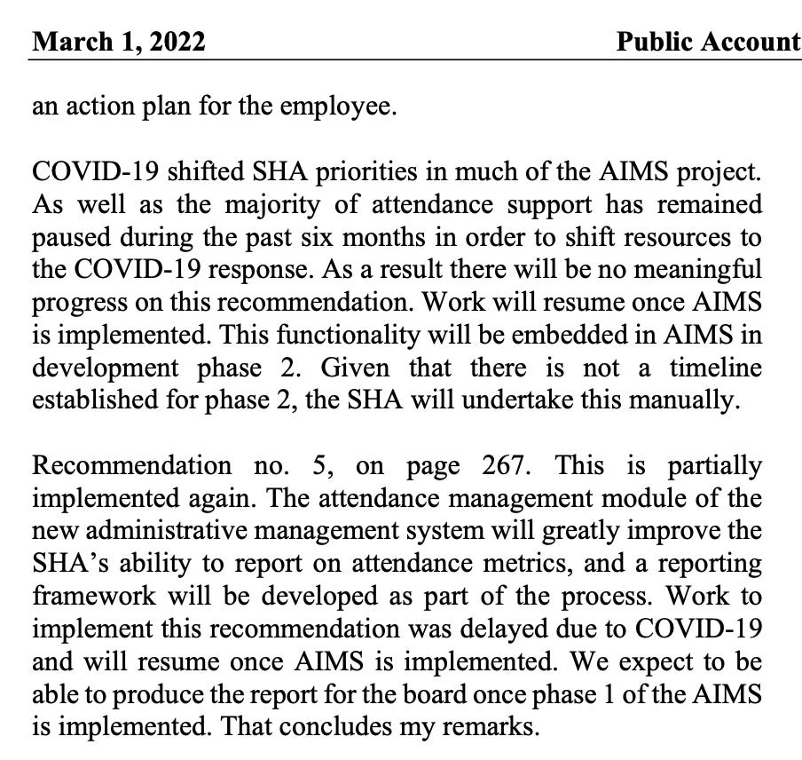 The project has lingered for years, soaking up massive amounts of time, money, and internal SHA resources. Former Health Ministers and their deputies touted AIMS as the cure for chronic problems flagged by the Provincial Auditor, including staff absenteeism, training gaps, and fragmented scheduling.