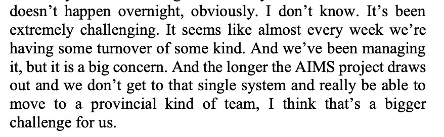 TLDR; AIMS was conceived as a solution meant to integrate 82 former health care regions’ administration and payroll systems into a single platform.